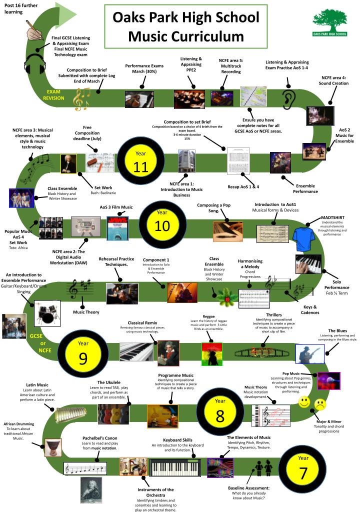 usic at Oaks Park aims to engage and inspire pupils to develop a love of music and their talent as musicians, and so increase their self-confidence, creativity and sense of achievement. As pupils progress, they should develop the skills to compose, and to listen with discrimination and perform with passion.